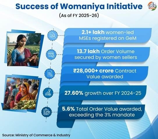চলিত ২০২৫–২৬ বিত্তীয় বৰ্ষত ২.১ লাখতকৈ অধিক মহিলা ক্ষুদ্ৰ উদ্যোগ (MSEs) জিইএম প্লেটফৰ্মত পঞ্জীয়নভুক্ত কৰা হৈছে আৰু ১৩.৭ লাখ অৰ্ডাৰ লাভ কৰিবলৈ সক্ষম হৈছে। ইয়াৰ উপৰিও মহিলা উদ্যোগীসকলক প্ৰদান কৰা মুঠ চুক্তিৰ মূল্য ₹২৮,০০০ কোটিতকৈ অধিক হৈছে, যি পূৰ্ববৰ্ষৰ তুলনাত ২৭.৬০ শতাংশ বৃদ্ধি দেখুৱাইছে।